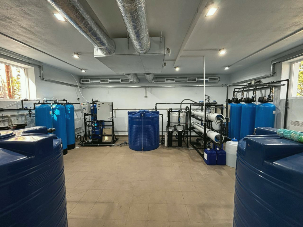 Комплекс обладнаний артезіанською свердловиною глибиною понад 115 метрів, з потужністю 3-4 кубометри води на годину. Процес очищення включає аерацію, механічну фільтрацію, зворотний осмос, озонування та обробку через вугільні фільтри.